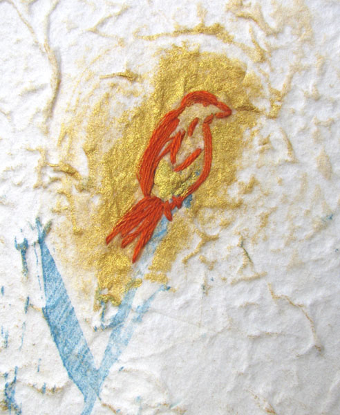 sunprints, woodcut (watercolor pigment, nori), mulberry paper, gold pigment, orange cotton thread. 28" x 19". 2010