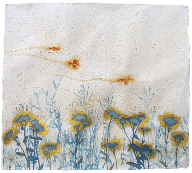 sunprints, woodcut (watercolor pigment, nori), mulberry paper, gold