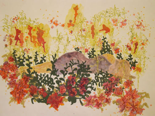watercolor monotype, woodcut, silkscreen, embroidery, ink on paper, 30"x22", 2007
