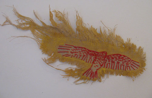 woodcut (sumi ink, nori), linen, gold pigment, red cotton thread.