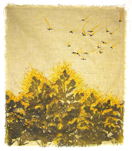 moku hanga woodcut, acrylic, embroidery on linen, 2009