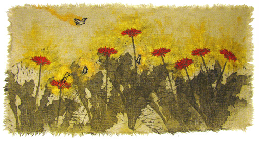 moku hanga woodcut, acrylic, embroidery on linen, 2009