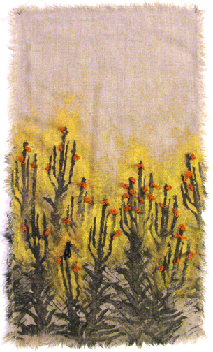 moku hanga woodcut, acrylic, embroidery on linen, 2009