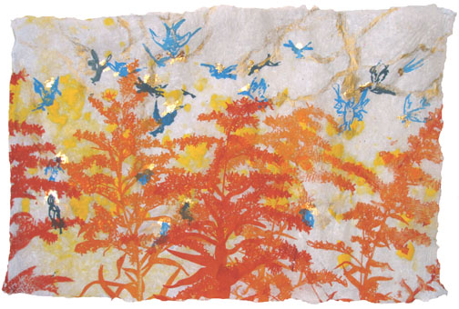 silkscreen, gold leaf, gold pigment on handmade denim paper with goldenrod-dyed cotton pulp, 15"x11", 2009