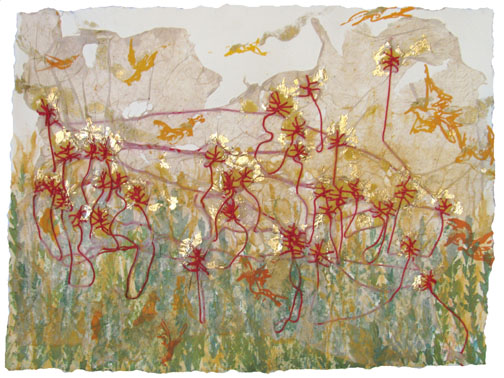 linoleum prints, gold leaf, silkscreen, ochre pigment, embroidery, handmade weed paper with goldenrod-dyed cotton pulp on paper, 15"x12", 2009