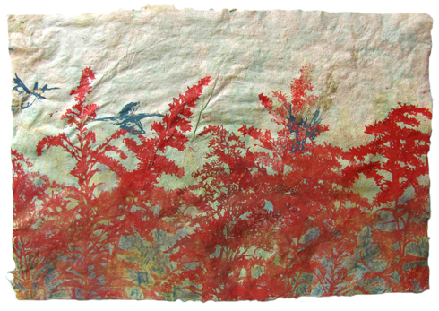 silkscreen, gold pigment, ochre pigment, indigo pigment on handmade weed paper, 15"x11"