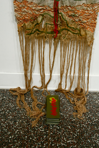 woodcut, gold leaf, plant dye, embroidery, beeswax on linen, 27"x180", 2008